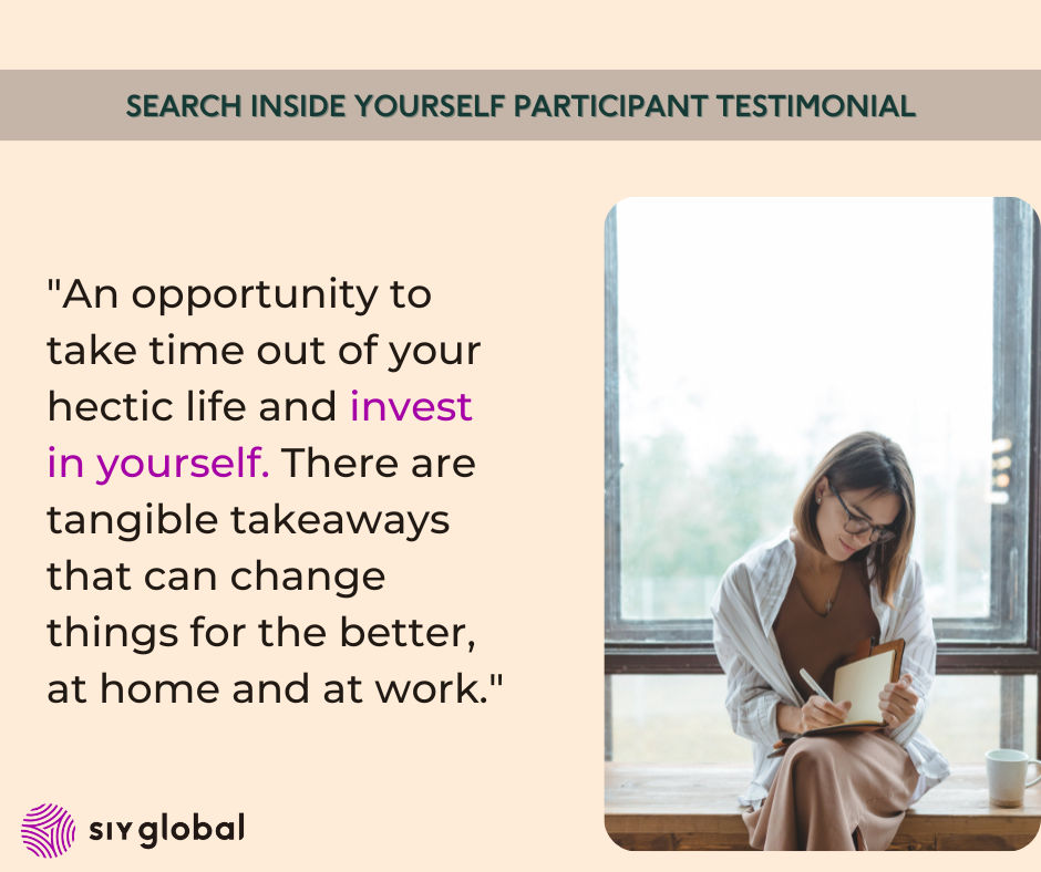Plain text: "An opportunity to take time out of your hectic life and invest in yourself. There are tangible takeaways that can change things for the better, at home and at work."
